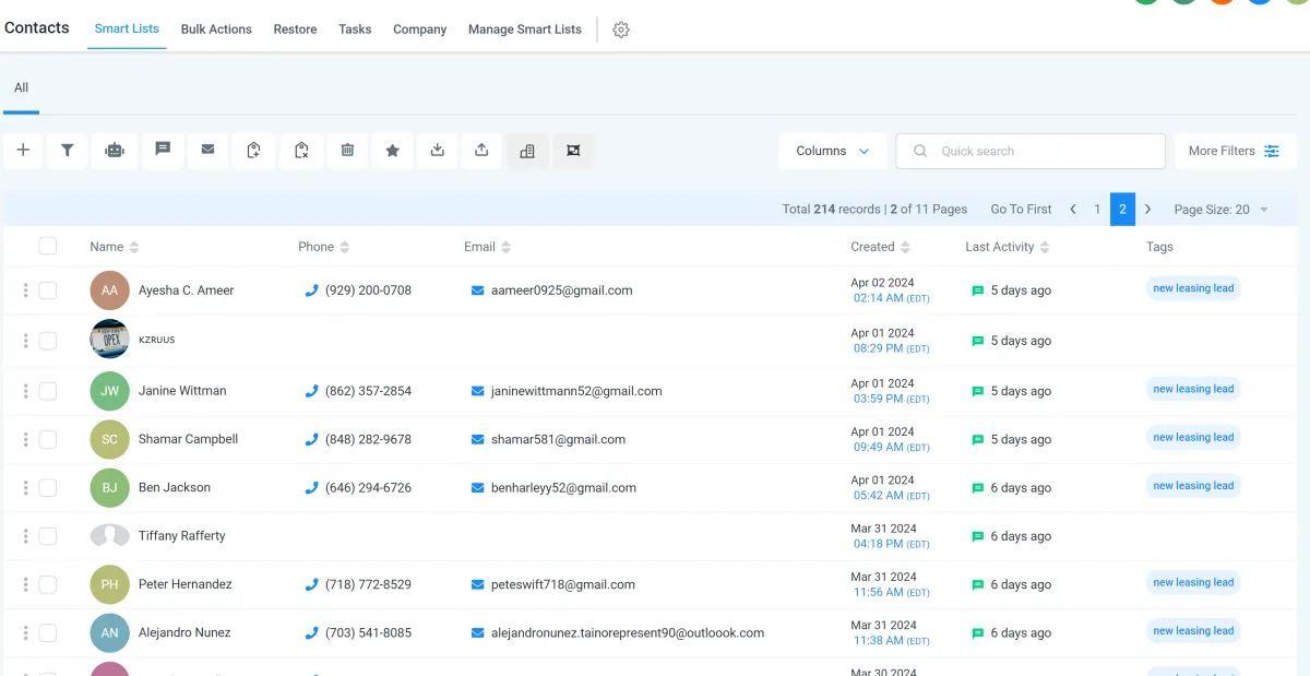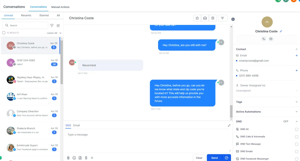 Our contacts database automatically saves and stores the contact info of any lead that is funneled through the app, whether it be from Facebook, Instagram, SMS, email, and more. The default information that is saved for them includes, but is not limited to their name, phone number, and email. In the case you ever want to do an email or SMS promo blast, the list is already prepared and ready to send out your blast for you.